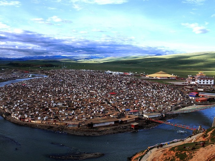 2. 亚青寺位于四川白玉县,四周是白雪皑皑的群山。以曲水河为界,亚青寺分为扎巴(出家男众)和觉姆两区。觉姆区面积约0.15平方公里,三面环水,聚集了上万觉姆,是世界上女性出家人最多的地方。