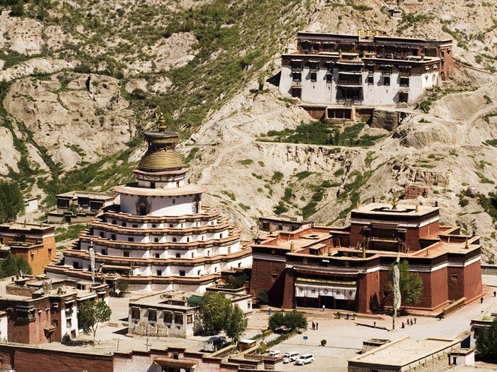 13. 白居寺是藏传佛教唯一一座的萨迦派、格鲁派、噶当派三大教派共存的寺庙。寺内的十万佛塔独具特色,由近百间佛堂依次重叠建起,共有九层,而殿堂内绘有十余万佛像,因此得名。