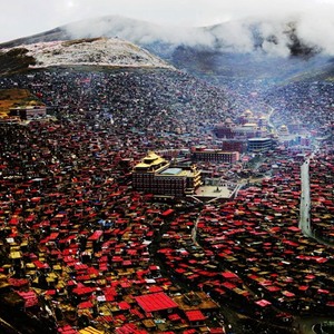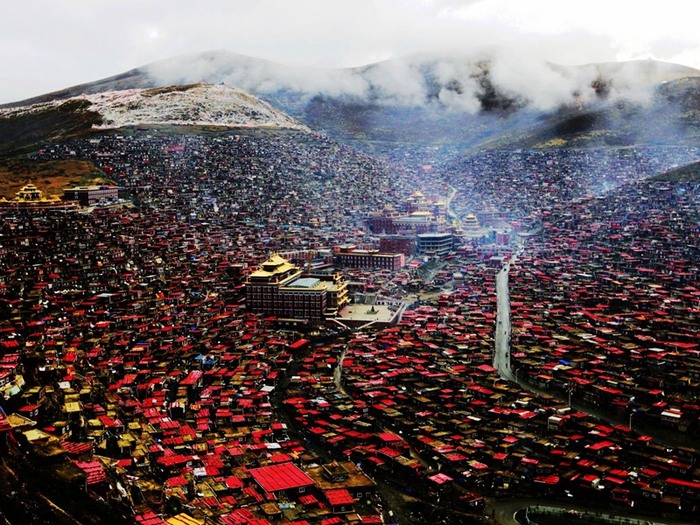 4. 色达五明佛学院建在离色达县城约20公里的喇荣沟,属藏传佛教宁玛派,是世界最大的佛学院。连绵数公里的山谷布满了密密麻麻的小木棚屋,鳞次栉比地贴山而建,究竟有多少这样的小木屋谁也说不清。这里是一片红色的海洋,寺庙、经堂、房子是红色的,喇嘛、觉姆、居士的衣服是红色的,地毯是红色的,整个学院就像处在云端的红色佛国。