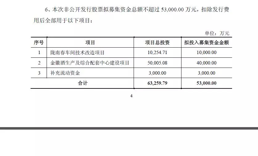 对此,金徽酒方面在公告中表示,本次非公开发行募集资金主要投入陇南春车间技术改造项目和金徽酒生产及综合配套中心建设项目,是促进公司产品品质和结构升级、提升生产和管理效率的重要步骤。