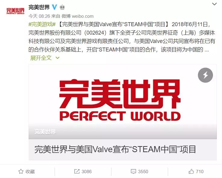 6月12日上午,有外媒传闻收到了Valve的官方消息,称Valve将与完美世界合作,推出Steam China。随后不久完美世界官方发微博确认了该条消息,表示将与Valve合作,共建“Steam China”,并放出了部分合作细则。