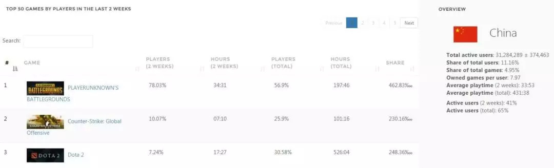 2017年12月,SteamSpy公布了一项数据:在2017年12月近两周内,Steam上中国活跃玩家数量与平均游戏时长均登顶榜首。其中中国活跃玩家数量占据了Steam活跃玩家数的19.48%,超过了第二名的美国接近5个百分点,而游戏时长方面,过去两周中国玩家游戏时长以24.88%的占比排在第一,位居第二的美国玩家游戏时长占比13.66%。