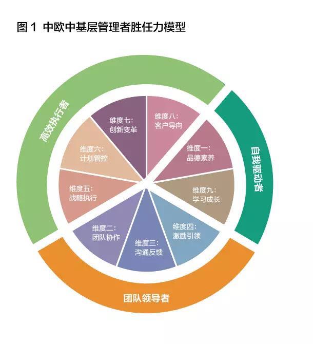 我们构建了九个维度共五十四项胜任行为的“中欧中基层管理者胜任力模型”,如图1所示。
