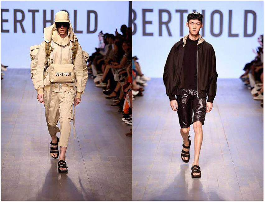 男装周第一天,Edward Crutchley和Matthew Miller的秀场便有拖鞋上阵,Berthold则是露指凉拖,款式简约得就像中国人每家每户都有的样式。皮质、配以同色系丝袜,或是光脚。后两天,除了依旧走朴素路线的Alex Mullins,其他品牌的拖鞋款式开始加料。Xander Zhou有布满logo的蓝色棉拖,Pronounce则是黑色皮拖搭配银色脚链。不过,相比上半身的造型,拖鞋还是当之无愧的低调担当。