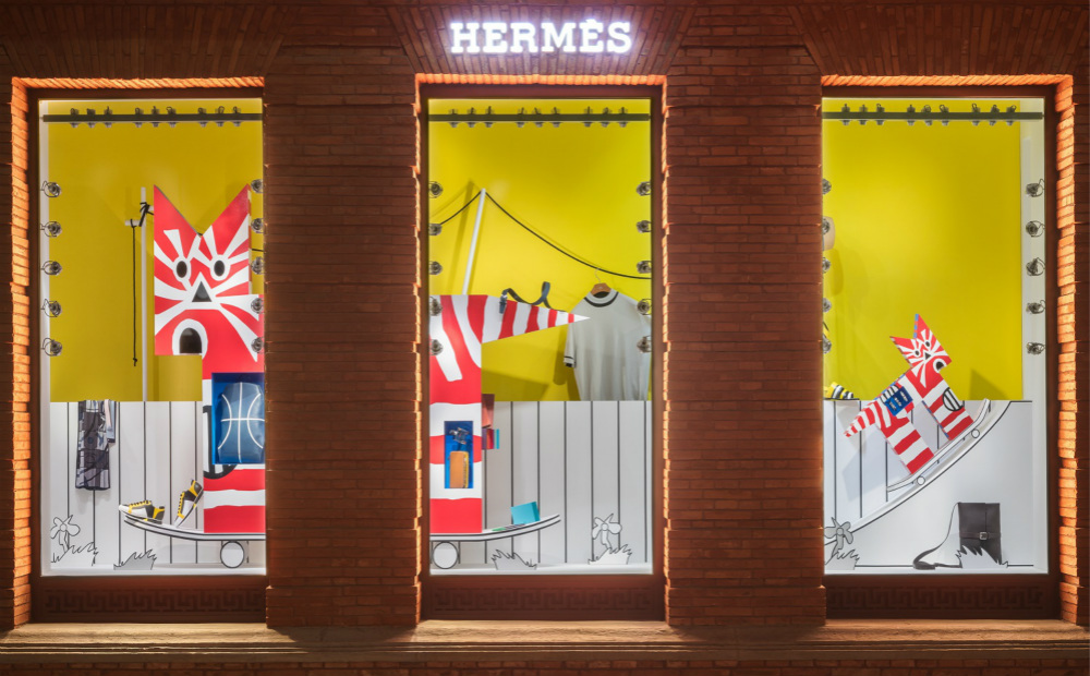 这些只是冰山一角,对爱马仕来说,最重要的营销渠道是门店橱窗。每一季度,品牌都会为全球五家爱马仕之家(Maison Hermès),即巴黎福宝大道、纽约麦迪逊大道、东京银座、首尔道山公园,以及上海淮海中路店铺邀请艺术家设计橱窗。最新的2018年夏季橱窗就邀请了英国艺术家组合Joanne Tatham和Tom O’Sullivan,以“抽象玩趣”为主题,展现抽象艺术,女士橱窗的背景以白描笔触勾勒出峰峦叠嶂的苏格兰高地,而男士橱窗则营造出典型英式后花园的场景。