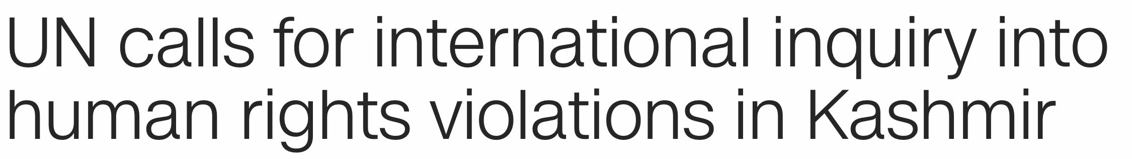 【联合国呼吁国际社会调查克什米尔人权问题】联合国首次发布克什米尔地区人权报告,谴责印度与巴基斯坦政府在该争议地区的行动严重违反人权,并呼吁国际社会介入调查。
