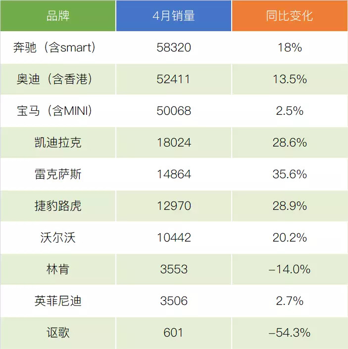 继续狂奔中的凯迪拉克,离月均2万辆的水平越来越近了。不过4月28.6%的同比增长率,比全进口的雷克萨斯略低。