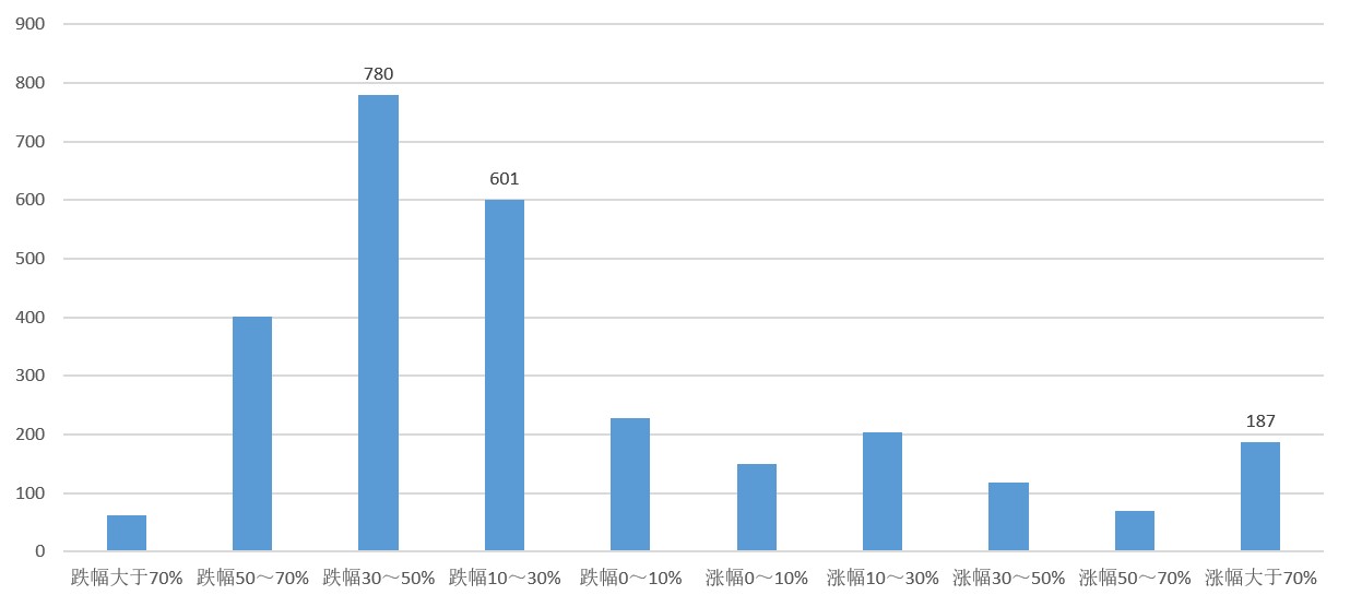可以发现,在相较于沪指2638点时跌幅排名前20位的股票中,有不少都曾陷入财务危机,典型的如*ST保千(600074.SH)、乐视网(300104.SZ)等。而作为业绩表现堪忧个股集中营的ST股中,有73只自沪指2638点至今区间涨幅为负,在纳入统计范围内的80只ST股票中占比91%,同时有八成的ST股区间跌幅均超过了30%。