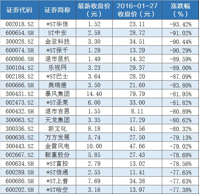 观察跌幅最大的20只股票可见,其中有9只属于ST股票,还有退市昆机(600806.SH)、退市吉恩(600432.SH)等两只已经进入了退市整理期的股票,上述合计占比高达55%,最惨的*ST华信(002018.SZ)截至6月19日的最新收盘价更是已经跌至1.52元/股,相较于沪指2638点时跌幅高达93.42%。