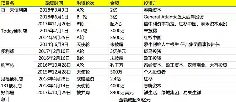 便利店融资统计(数据来自公开信息)