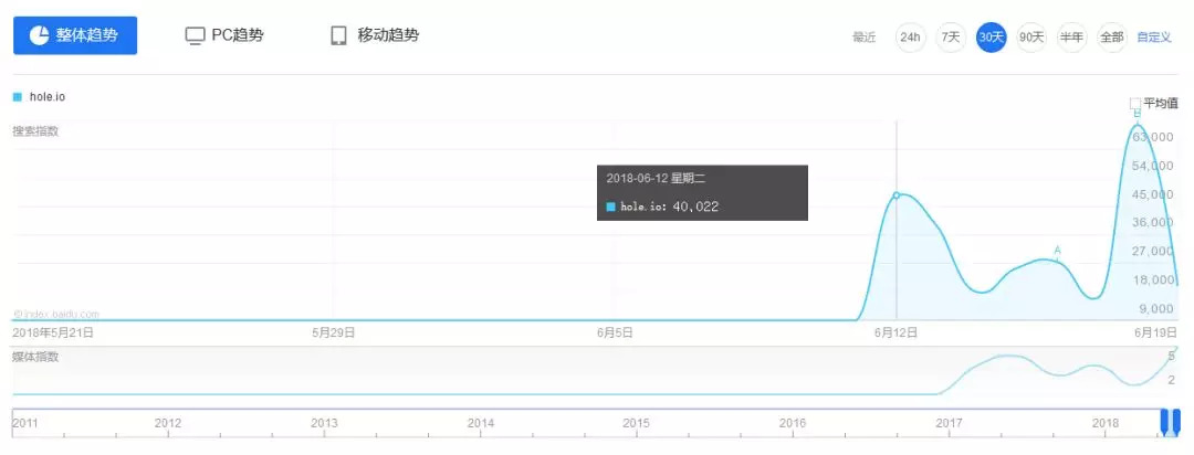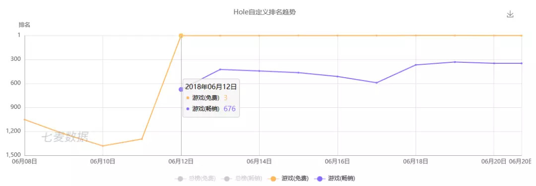 从《Hole.io》的App Store游戏免费榜排名曲线来看,这款游戏是从6月12日开始火起来的,而这也和《Hole.io》百度指数攀升的时间一致。