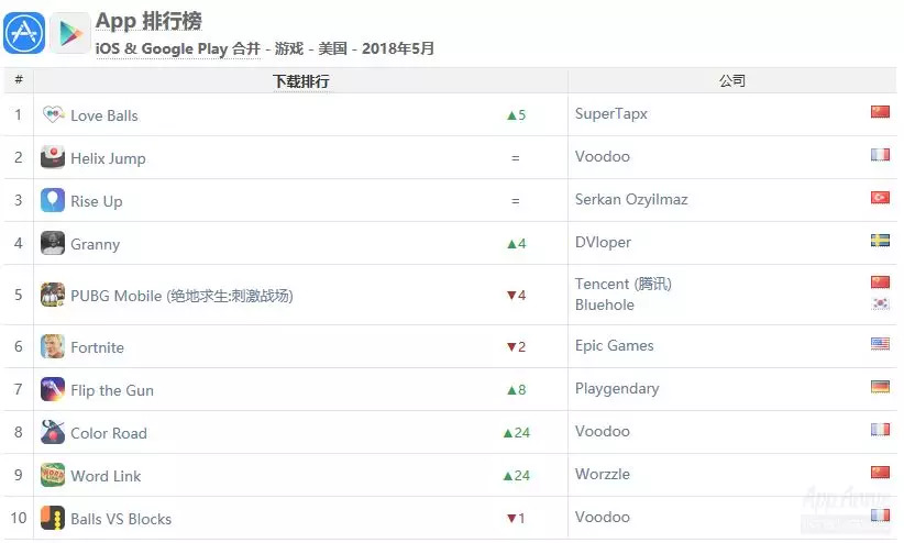从2017年下半年开始,海外市场的小游戏之风逐渐兴起。比如最典型的美国市场,在App Annie发布的5月全球手游指数中,手游下载量TOP10里有7款休闲小游戏。全球市场上也涌现出越来越多专注小游戏的游戏厂商,比如拿下5月全球游戏下载量TOP1的《Love Balls》发行商SuperTapx,凭借《Flip the Gun》进入5月全球游戏下载量公司排名TOP10的德国游戏商Playgendary。