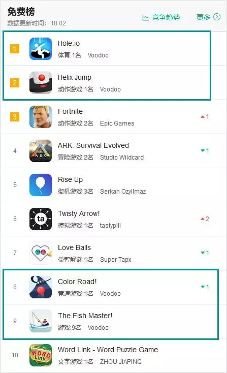 前面提到,《Hole.io》的发行商是小游戏巨头Voodoo,其旗下《Helix Jump》、《Dune!》等多款小游戏都曾风靡全球。在今天的美国App Store游戏免费榜中,Voodoo有4款小游戏进入了TOP10。