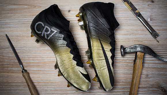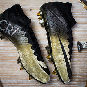 2. 耐克此次选择金色为这款足球鞋的主色调,CR系列正是以其姓名首字母缩写而成,2013年耐克曾推出饰以星空图案的刺客战靴。
