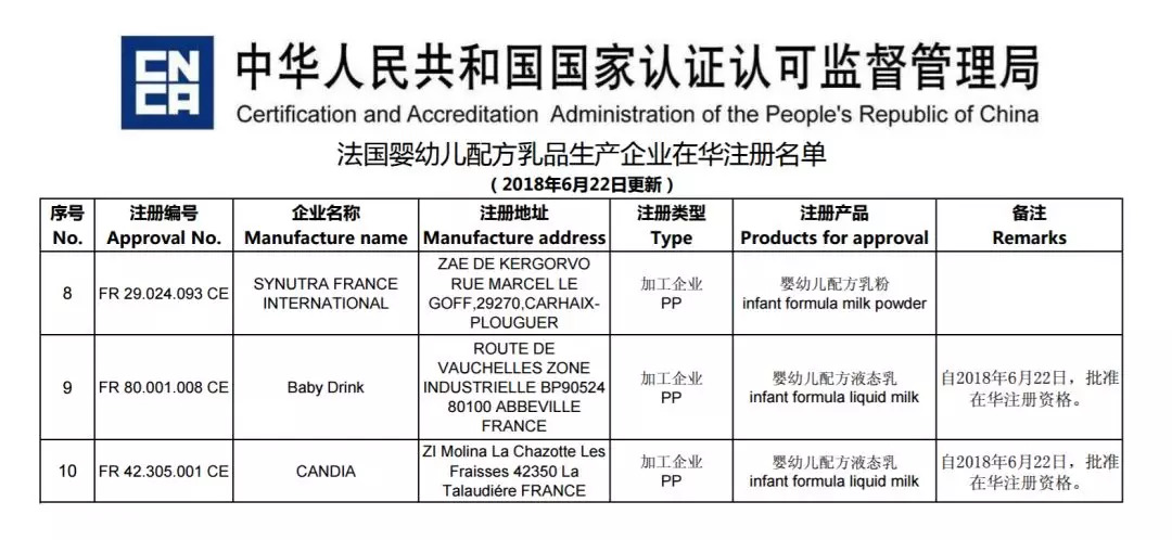 小食代在国家认监委网站上看到,自2018年6月22日,获批在华注册资格的乳品生产企业分别是Baby Drink和CANDIA。这意味着,两家企业拿到了对华出口婴配液态奶产品的“入场券”。