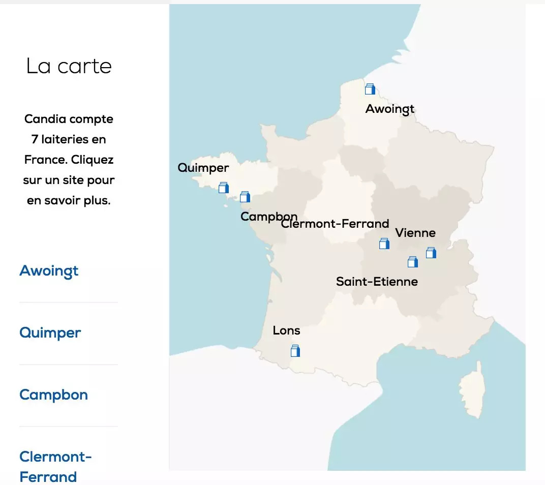 根据官网资料,Candia在法国饮用牛奶市场中排名第一。该公司成立于1971,旗下共有7家生产工厂,在欧洲拥有1500名员工,营业额为13亿欧元。