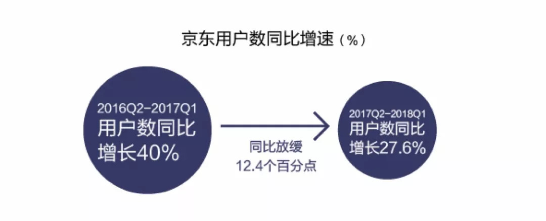 在用户增长方面,京东同样面临着瓶颈。根据京东2018年第一季度财报显示,截至2018年3月31日,过去12个月活跃用户数达3.018亿,同比增长27.6%。而去年同期这一数据为40%,同比放缓12.4个百分点。