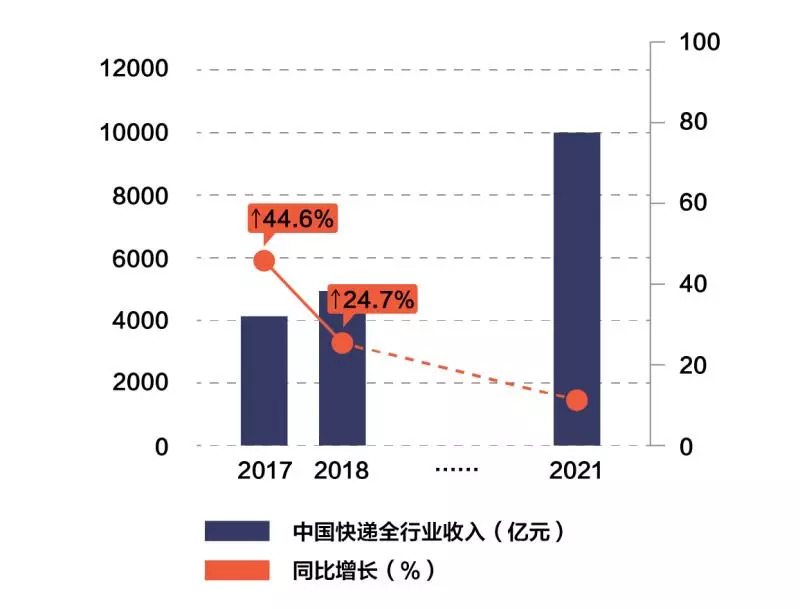 2017年,中国快递全行业收入4957亿,同比增长24.7%,而2016年全行业收入完成4005亿元,同比增长44.6%,全行业增速放缓,预计2021年快递行业总收入将达到1万亿。对标京东物流的“五年千亿”规划,其2021年市场份额要达到10%。前有顺丰、“通达系”等多座大山盘踞,京东抢占市场份额的难度不可谓之不大。