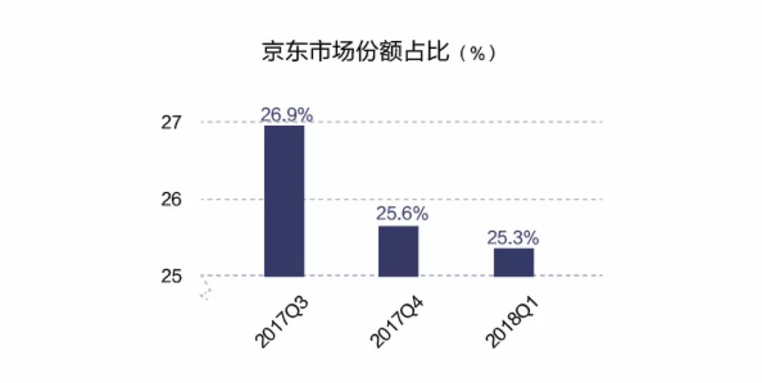 在市场份额方面,京东面临着持续下滑的挑战,京东2017年第三季度市场份额为26.9%,2017年第 4季度市场份额为25.6%,2018年第一季度,京东市场份额为25.3%,连续三个季度下滑。