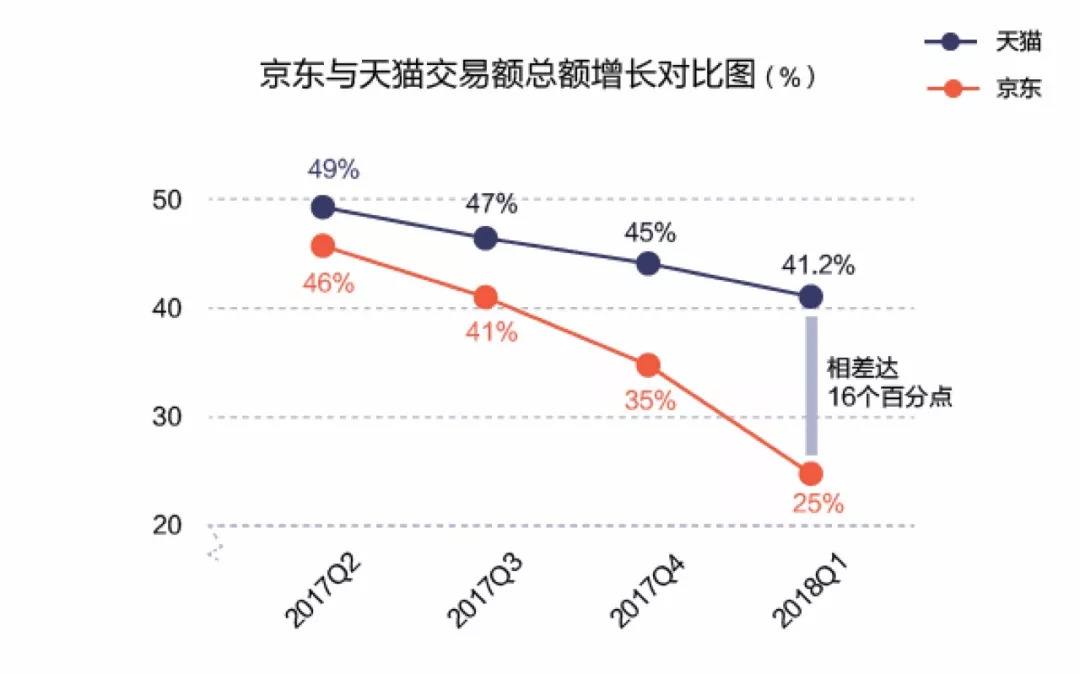 对比天猫与京东GMV增速,从2017年第三季度开始,两者距离越来越大,其中2018年第一季度同期增长相差达16个百分点。