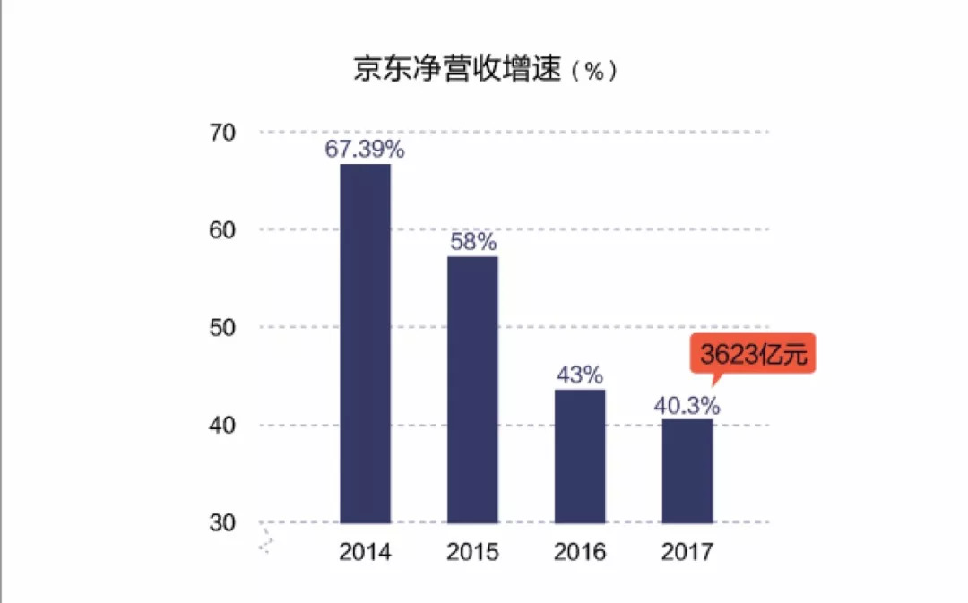 从全年看,京东净营收增速也在逐年放缓,2014年、2015年、2016年、2017年增速分别为67.39%、58%和43%、40.3%。