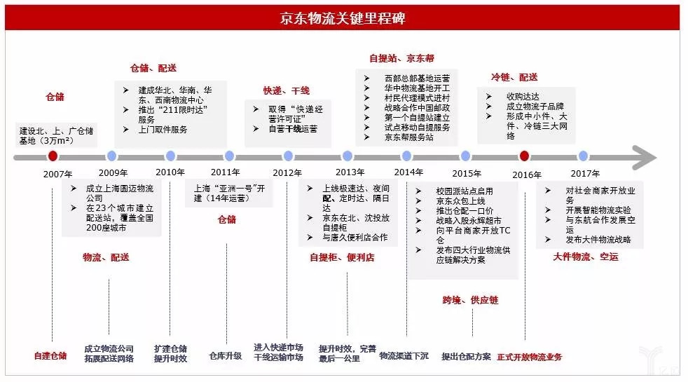 2017年4月,京东物流成立子集团独立运营,将原本以自营电商物流为主的模式转变为向全社会开放的第三方物流。显然,京东物流是继京东商城、京东金融后的第三张王牌,京东物流独立运营背后的行业大环境,是快递物流行业的上市潮以及未来零售时代物流等基础设施日趋明显的价值存在。