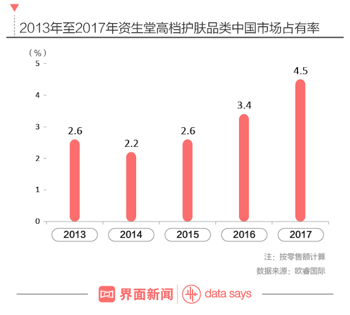 资生堂“高档化妆品优先”的改革战略恰好呼应了这一市场变化,并取得了显著的成效。欧睿国际提供的数据显示,资生堂在中国高档护肤品市场的占有率从2015年的2.6%增长至2017年的4.5%,几乎翻了一倍。