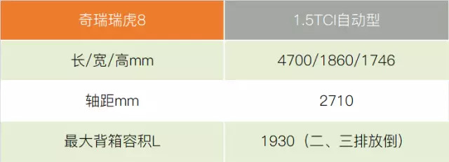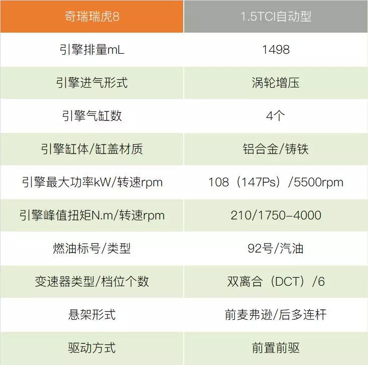 按照惯例,我们在动态体验前还是先来了解一下瑞虎8的三大件构成吧。它全系搭载了由奇瑞自主研发的1.5升直列4缸涡轮增压引擎,最大功率与峰值扭矩分别为108kW和210N.m,从表格中不难看出,该引擎的峰值扭矩虽然不太突出,但却具有较宽泛的输出范围,其优势当然是中、后段加速时照样能维持良好的动力特性。