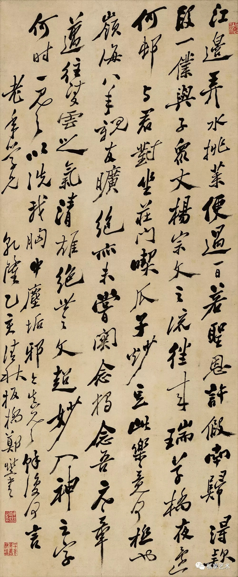 他的艺术作品中,诗、书、画、印有机融合,浑然天成,独创格,达到了一种新的艺术境界。除上面提到的表现在章法笔法上外,更重要的是表现在思想上。郑板桥的题画诗文,在思想性、艺术性方面有着过人之处。画竹寄情,借物咏志,在板桥之前已是文人故风。透过竹的绰约风姿,诗家词客看到的是劲节、高志、虚心,这些形而上的品质,画家描绘其形为着表意。但是,与前人较多视竹为个体生命的自重与自傲不同、郑板桥赋予竹更广阔的内涵。尤其在通过画竹表达他复杂的官场意绪与人生感悟方面,是远胜于他之前的柯九思、李珩诸家的。
