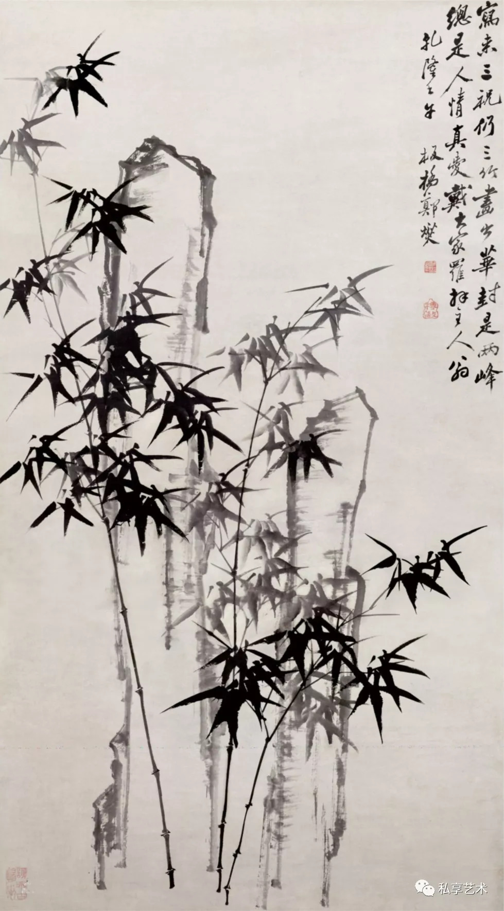 如他在一则题画文字中写道:「江馆清秋,晨起看竹,烟光月影露气,皆浮动于疏枝密叶之间,胸中勃勃,遂有画意。其实胸中之竹,并不是眼中之竹也。因而磨墨展纸,落笔倏作变相,手中之竹又不是胸中之竹也。总之,意在笔先者定则也;趣在法外者,化机也。独画云乎哉」。此处所说的「眼中之竹」是自然实景,是画家异于常人普通感受的对自然的观察;「胸中之竹」是艺术创作时的构思,是现实中竹的客观形象和画家思想感情主观因素相融合而形成的画象;「手中之竹」则是通过画家的创造性劳动,运用绘画艺术的技巧和独特的绘画语言,将头脑中的意象「物化」为艺术作品,创造出可供其他人欣赏的艺术形象,是艺术创作过程的实现。他强调这三种竹是不同的,这不只是说明艺术创作应源于生活,更重要的是要不同于生活。「意在笔先」、「趣在法外」,这一整套创作方法是很值得我们今天借鉴的。