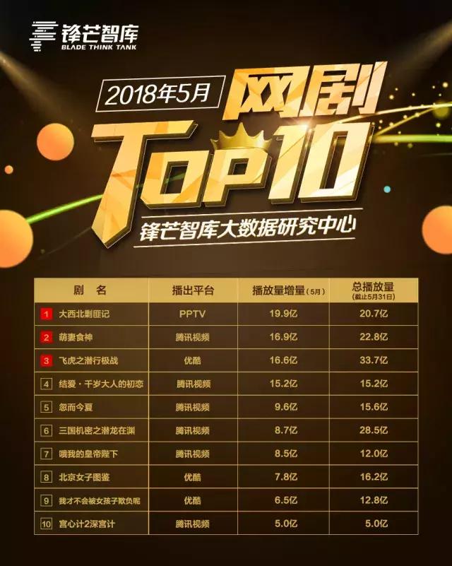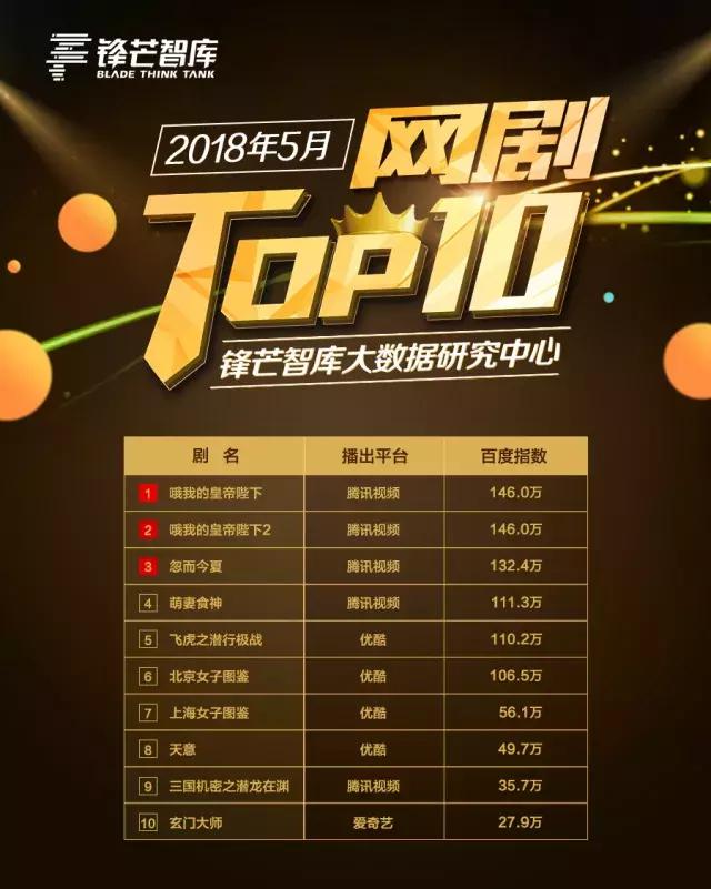 题材的多元化与小众化,成为网剧市场不可逆的大势。尽管2018年网剧市场并未出现爆款,但仍有不乏亮点的剧集出现。如5月网剧市场的《哦!我的皇帝陛下》系列,证明了古偶甜宠题材的市场冗余度;《结爱·千岁大人的初恋》虽高开低走,但也燃起了观众对国产偶像剧的希望;此外,《北京女子图鉴》《上海女子图鉴》等剧集在锋芒智库大数据研究中心的TOP10中榜上有名,也证明了极具现实意义的网剧,仍有市场空间。