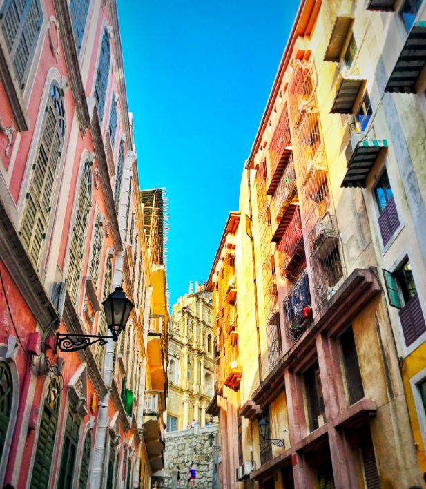 恋爱巷很短,从头到尾两三分钟就能逛完,但这条盈满了少女心的街巷,两边都是色彩缤纷的建筑,非常适合走走停停拍拍照。而且站在恋爱巷的巷口,抬头就能看见牌坊,也不失为打卡大三巴的独特角度。