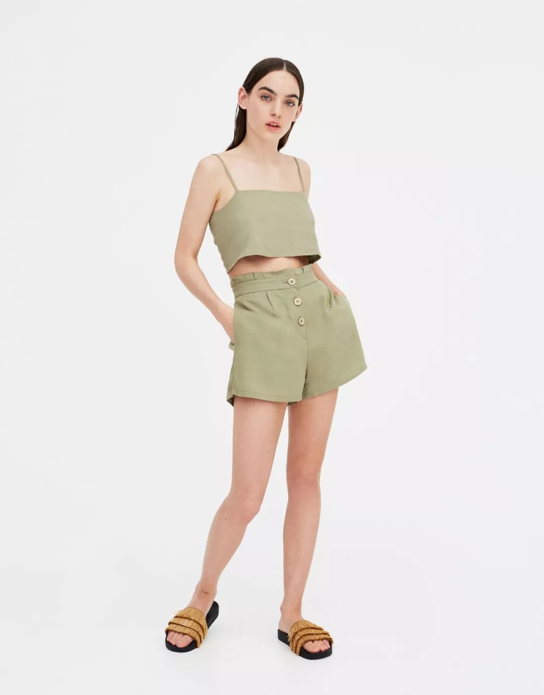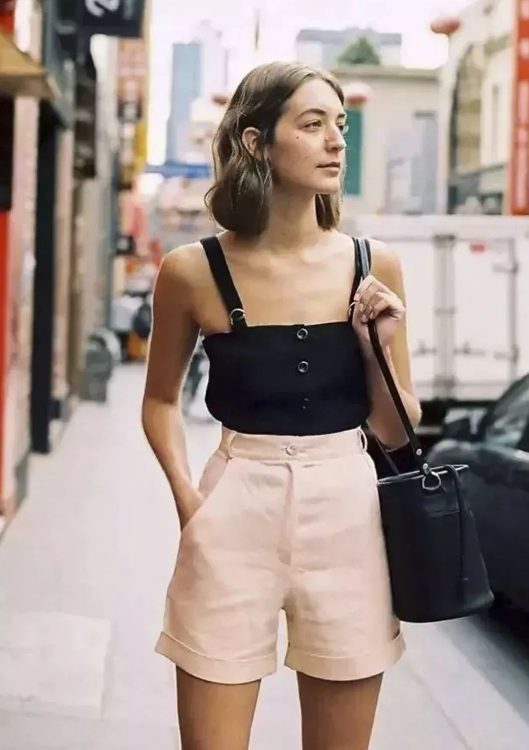 吊带紧身上衣,虽然露肤面积比较多,但其实还蛮有少女气质的。搭配中性风的爸爸裤,更显得青春时尚。