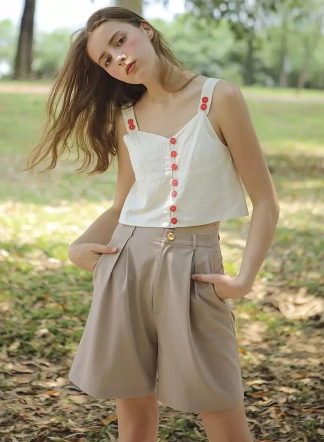 还有一种小心机的搭配,性感靓丽与青春俏皮兼备,比如这种扣子撞色的小巧思,穿上就像蜜糖女孩一样甜。或是不那么一本正经的带有圆点波普感的爸爸裤搭配又可以融入一些随性洒脱感。
