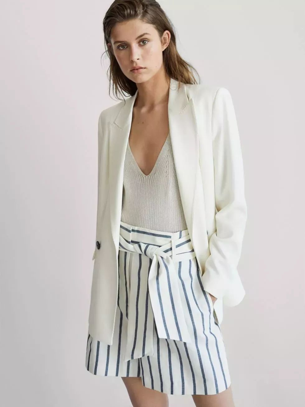 如果觉得很难驾驭,那么选择套装会让整个设计大气简约,上身自带气场,随性洒脱中给人一种清新脱俗的气质感。尤其是小个子女生选择竖条纹款会拉长比例看上去挺拔。