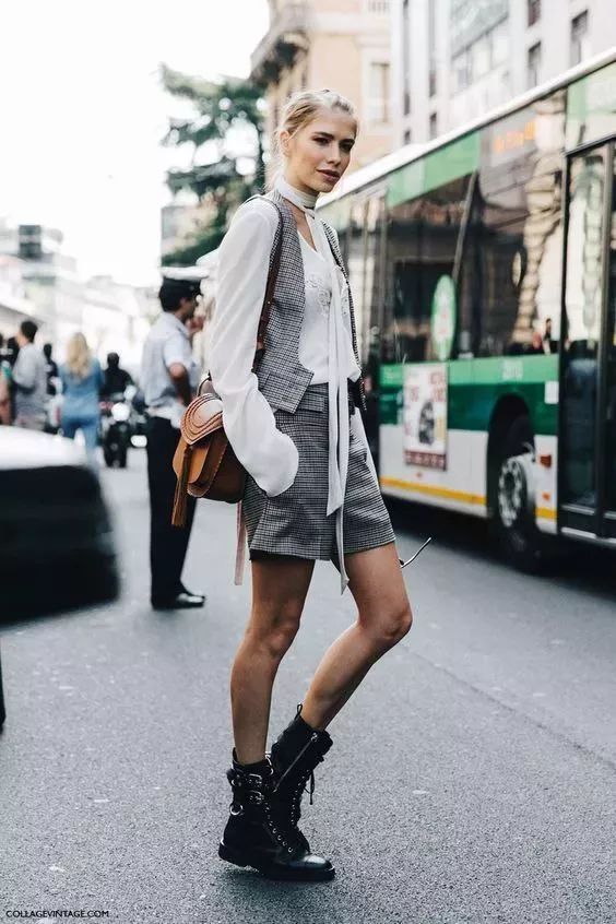 同色系又不那么单调乏味,脚踩马丁靴的装扮,通勤约会都很赞,洗刷印象中套装平淡无奇的印象。