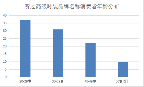 由上图发现几乎每个年龄层都听过LV、GUCCI、BURBERRY…等品牌名称,本问卷填写人年龄层以20-29岁居多,故20-29岁听过高级品牌的人最多,其中30~39岁、40~49岁随年龄递增而减少。