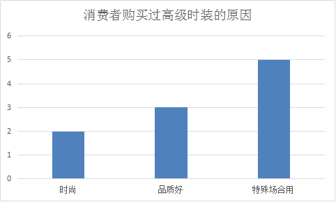 问卷100份中只有10份有购买过名牌女装,由上图显示购买原因以特殊场合用居多,大多是因为重要场合的需要才会购买。
