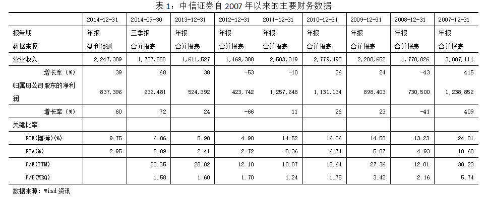 过去两个多月,A股市场中的券商股多数都有200%的涨幅,已经上市的十家券商公司2014年预测市盈率的中位数也高达46倍。对,你没有听错,46倍。像总市值接近4000亿的中信证券(600030.SH)2014年预测市盈率居然高达50倍。虽然牛市来了,券商的业绩确实会向好,无论是经纪业务还是发行业务,都会表现不错,但是我相信很少人会愚蠢到认为券商业绩从此就一路上涨了,因为股市有周期,有牛市必有熊市,这个道理对于一个哪怕是从来不接触股票的人都会知道,而券商的收入和盈利则会随着股市的周期波动,是一种强周期公司。我们不妨来看看中信证券自2007年以来的主要财务数据,从中我们可以获得对周期性公司的直观认识: