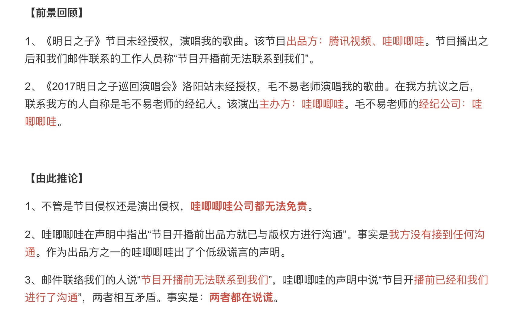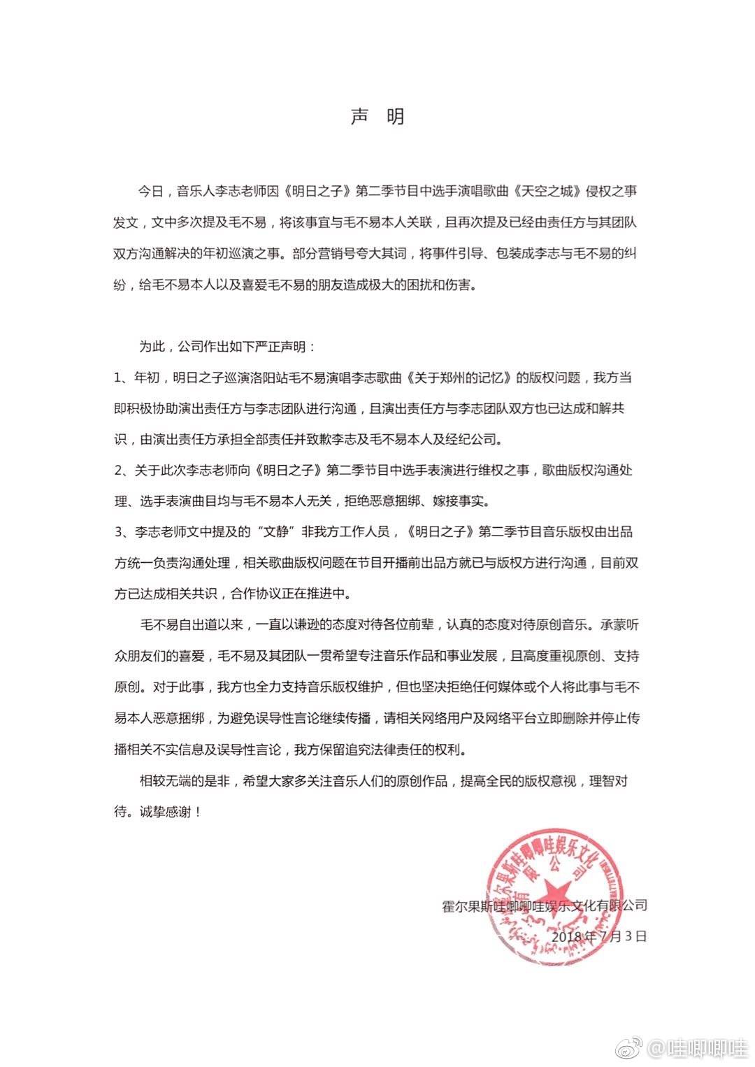 7月3日下午,毛不易签约的公司哇唧唧哇也在微博上发出了声明,主要表达了三点内容:第一,《明日之子》洛阳巡演侵权已经和解,由演出责任方承担全部责任;第二,邱虹凯的选曲与毛不易无关,拒绝恶意捆绑,嫁接事实;第三,与李志团队邮件来往的人并非毛不易公司人员,且《明日之子》的所有音乐由出品方负责,版权由出品方与版权方进行沟通。