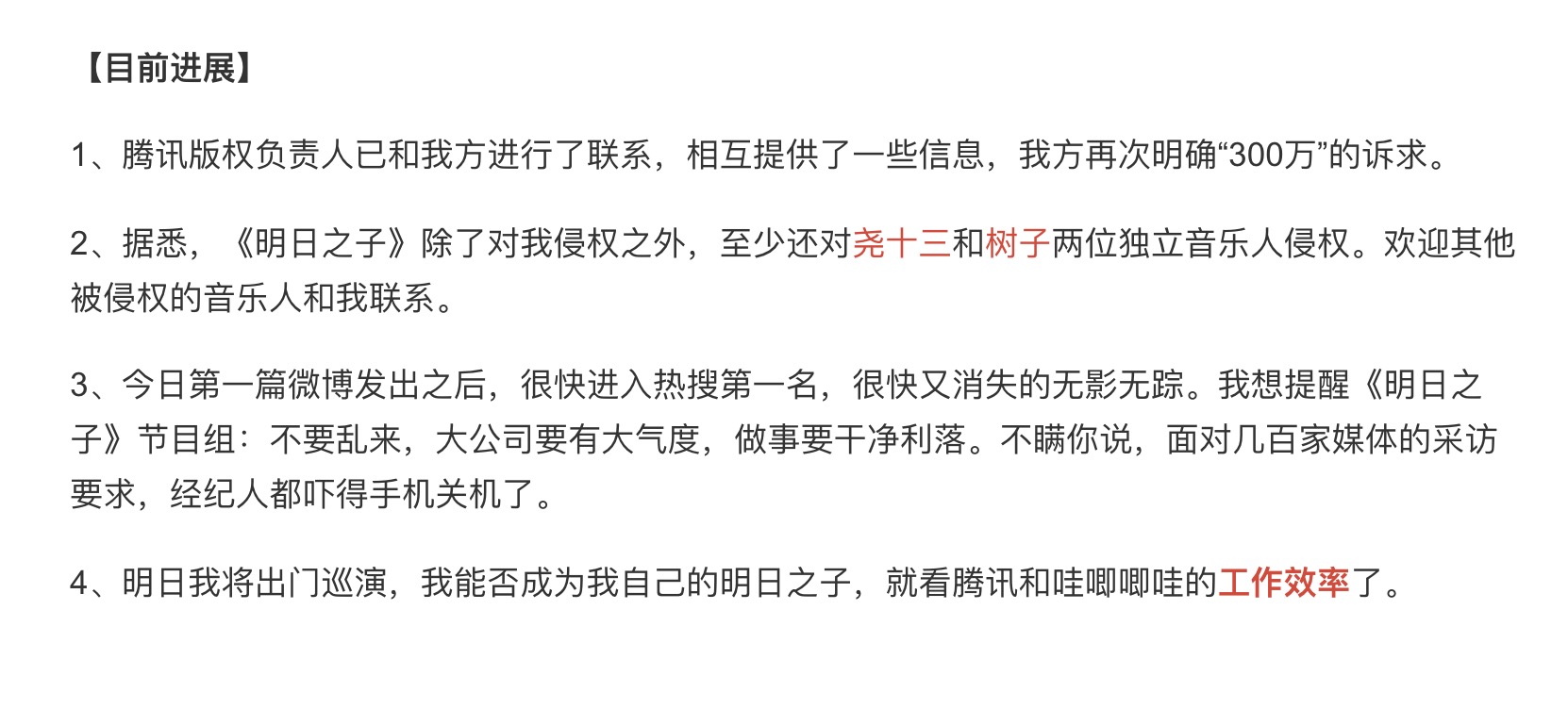 但这封邮件之中“牛逼哄哄的商业洽谈气氛”似乎惹怒了李志,他要求与《明日之子》在法庭上见,并提出300万的赔偿数额,其中,100万是《明日之子》第二季的侵权费用,100万是年初毛不易的演出侵权费,100万用作赔偿其他被侵权的音乐人。