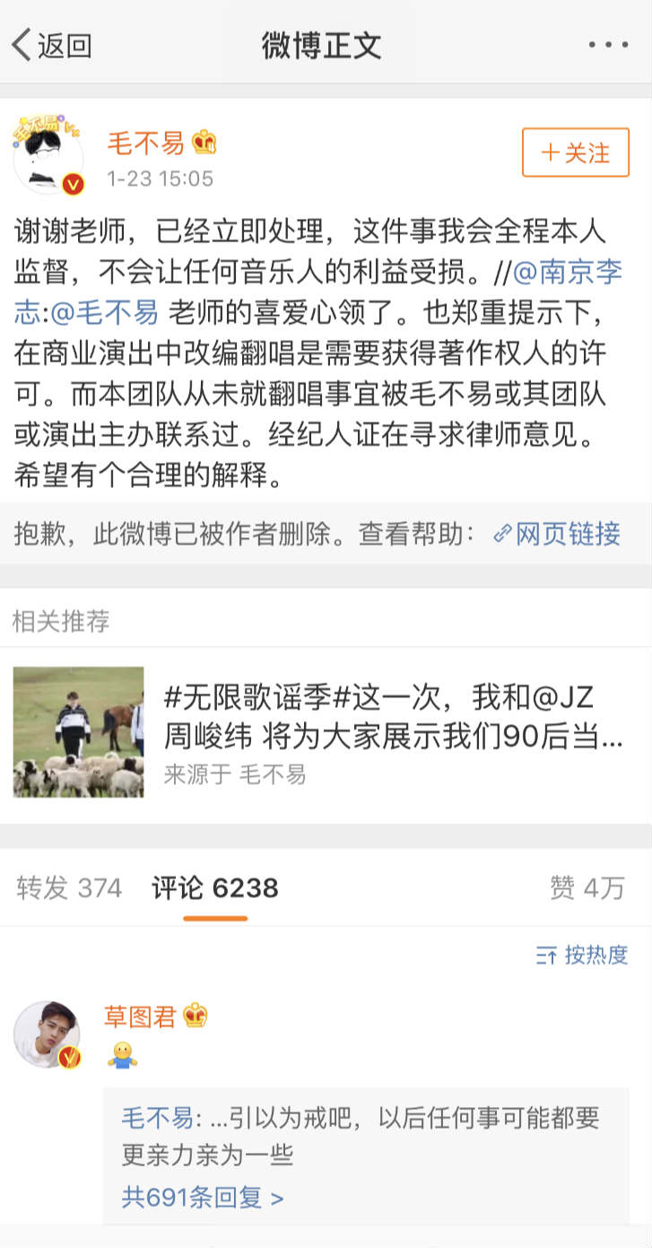 就在今年年初,毛不易就曾在《明日之子》洛阳巡演时翻唱了李志的《关于郑州的记忆》,当时李志就在微博上隔空喊话“在商业演出中改编翻唱需要获得著作权人的许可”,当时的巡演方也并未提前获得授权。不过,因为当时毛不易非常配合协商事宜,且十分尊重原创音乐,此事随即翻篇。