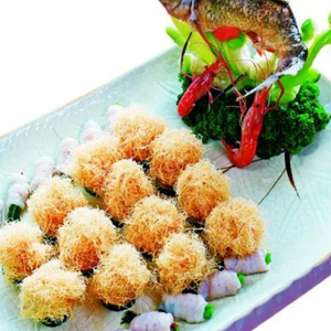也有选用野生鲮鱼背脊的皮,片成均匀的、约宽一厘米的丝,加上炸香的花生米,用醋调味,凉口,适合在夏季喝啤酒时食用。凉拌鱼皮还有一个美称——寒衣织锦。说的是凉涔涔的鱼皮与黄灿灿的姜丝纵横交织,像是金色纱线织成的寒衣,真是惟妙惟肖!