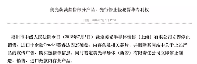 福州市中级人民法院今日(2018年7月3日)裁定,美光半导体销售(上海)有限公司立即停止销售、进口十余款Crucial英睿达固态硬盘、内存条及相关芯片,并删除其网站中关于上述产品的宣传广告、购买链接等信息。