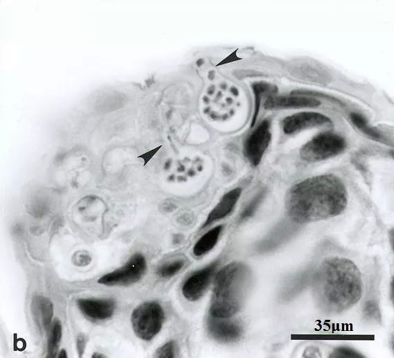 图示蛙壶菌在寄主表皮中形成导管(箭头处),从而向外释放孢子(图片源自维基百科)