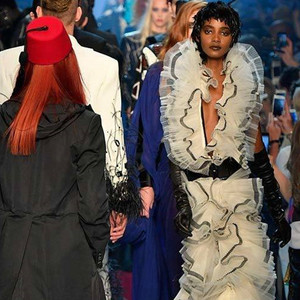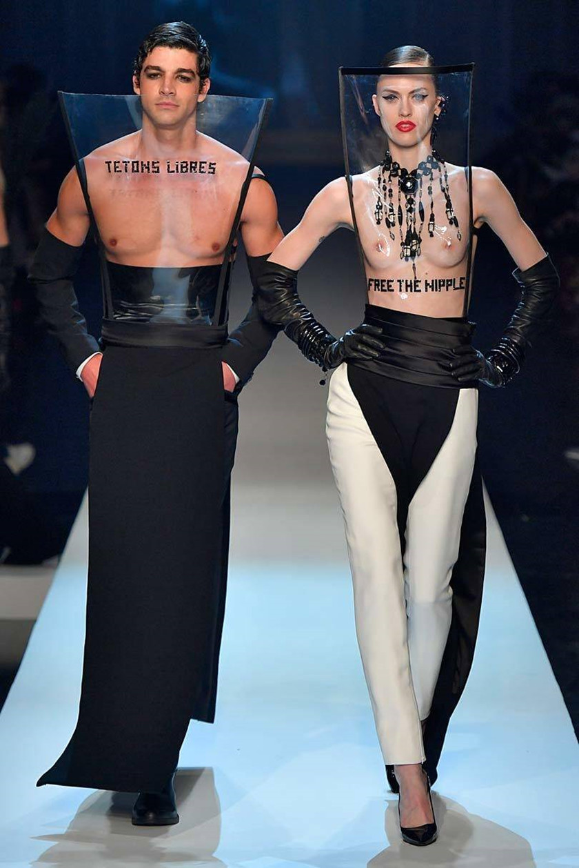 为了强调这一观点,他让一对赤裸着胸膛的男女模特同时走上t台,每个模特都穿着印有法语和英语的“Free the nipple(解放乳头)”字样的透明警服。