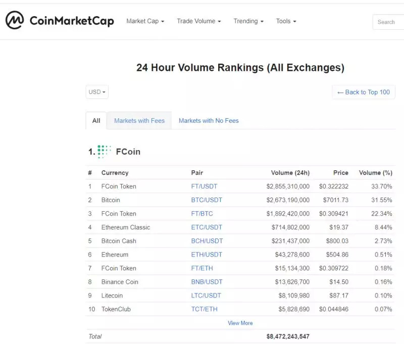 在CoinMarketCap收录的208个交易所中,FCoin交易量排名第一,且超过了第二名到第八名的总和。