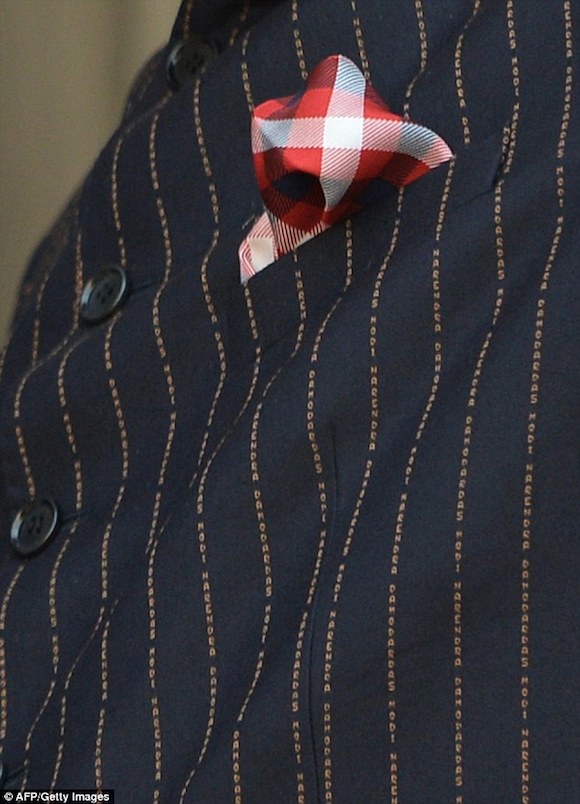 看起来就是很正常的细条纹西装啊!不过等等!在特写镜头下看根本就不是条纹,而是密密麻麻缝着莫迪的名字(Narendra Damodardas Modi)啊喂!
