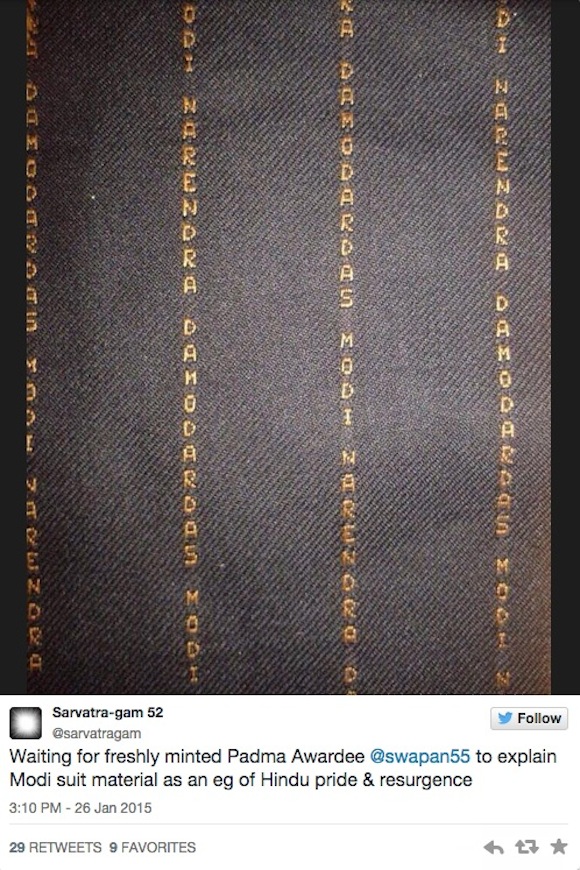 莫迪的服装师表示,这身衣服是特地为奥巴马来访而缝制的。他说:“我们听说他很喜欢这身衣服,因为它独一无二。”这位2001年以来一直参与为莫迪设计服装的设计师不愿透露自己的姓名。