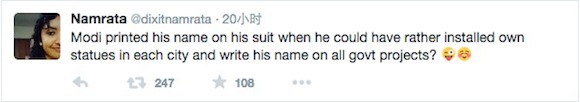 “莫迪把名字都綉在了他的套装上,他其实可以在每个城市都立一座自己的雕像,或者干脆在所有政府工程上写上自己的名字啊。”